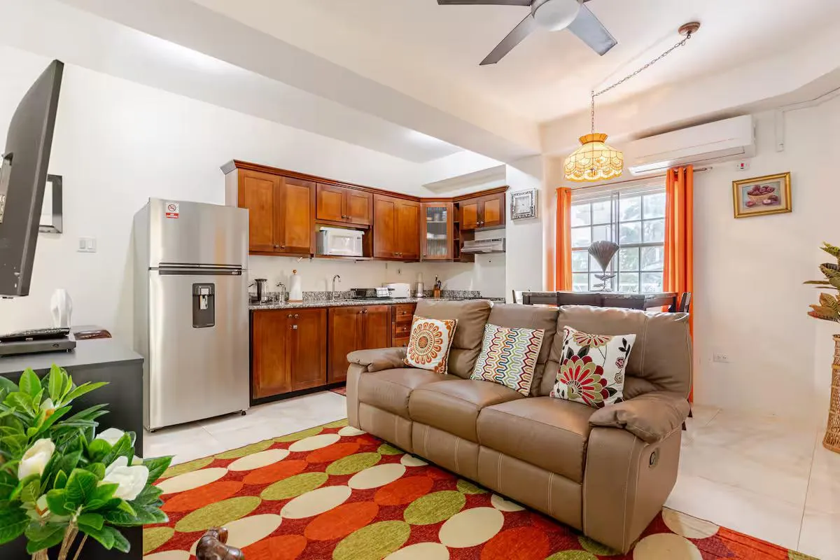 Enjoy the privacy of your unit in a gated community. A ground floor 2BR, full kitchen, & dining, reclining sofa and smart tv, and patio. Located in the centre of the community, you are neighbours with 6 apartments that share a common entrance to a flora'd courtyard and outdoor seating for a Jamican diner and club house. Steps from a pool and the stairway to a natural beach.